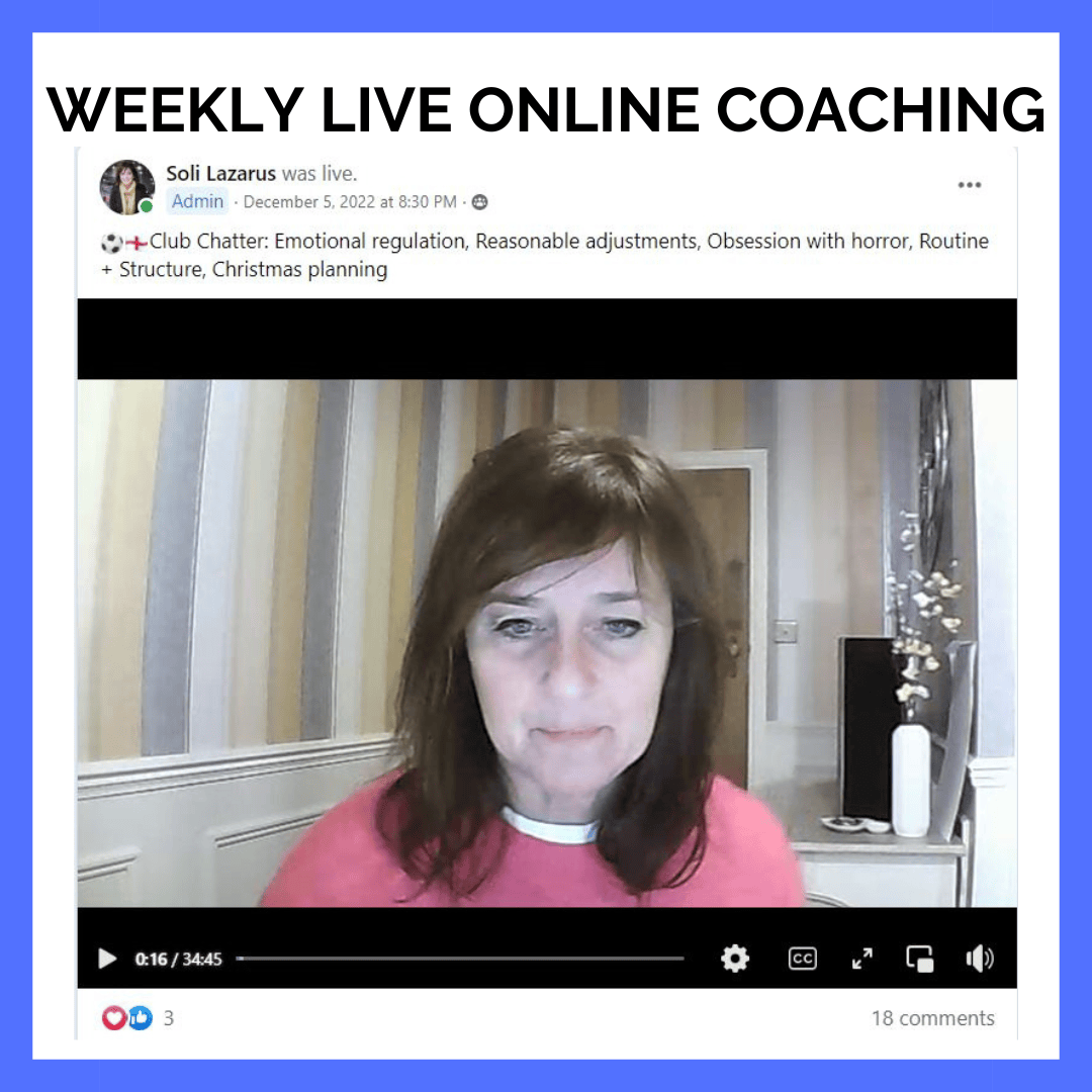 On Monday morning there will be a post in the Facebook group where members post their questions.. These can be about school, the law, siblings, bedtime, homework, screens. Anything to do with ADHD. At 9am to 9.30am every Tuesday Soli will go on camera live and will answer these questions. Members will be able to ask additional questions and contribute to the discussion by typing (don't worry you won't be on camera). Or you can just sit back and watch. The recording will stay up for 30 days (Facebook rules) so you can catch up if you can't watch live.